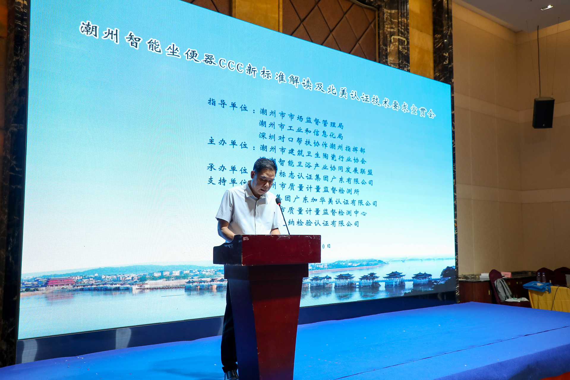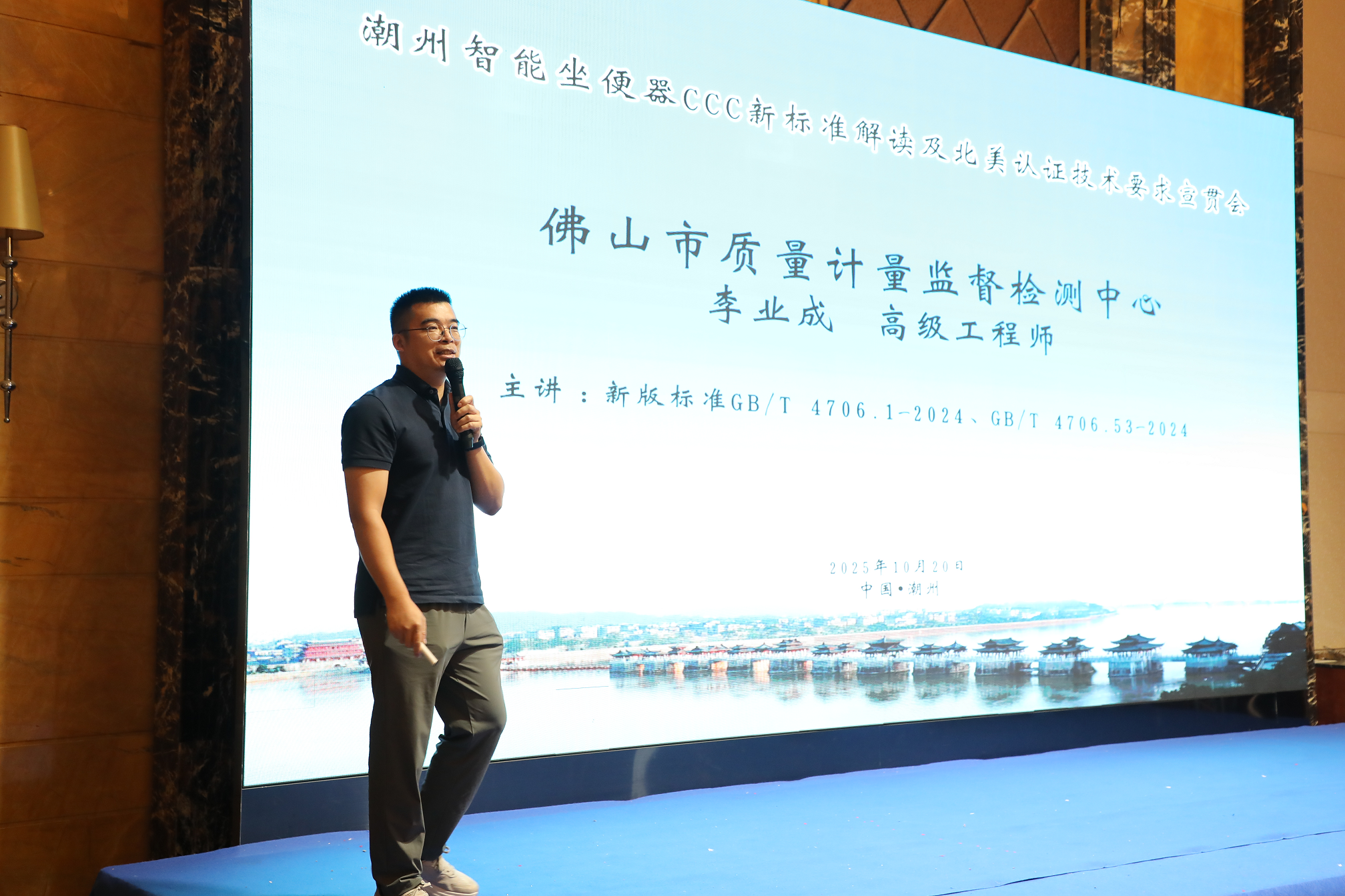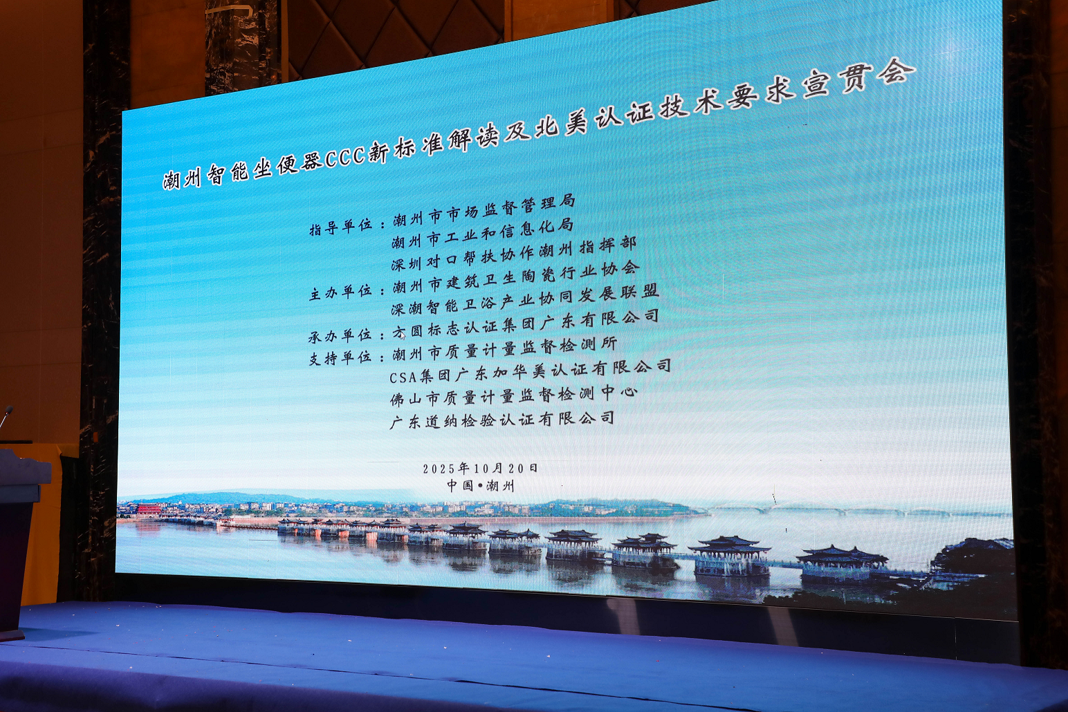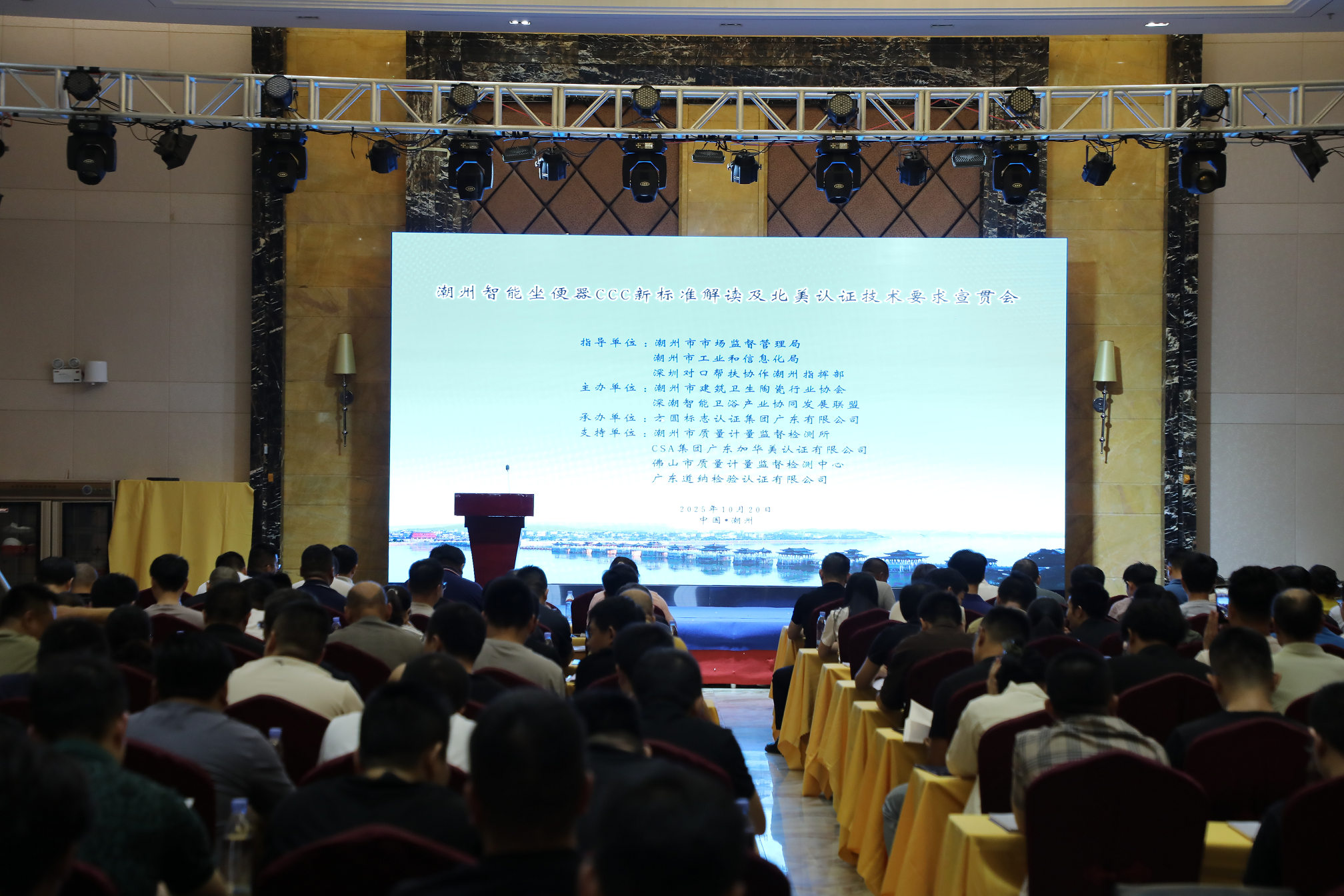 2025年10月20日下午,“智能马桶CCC新标准解读及北美认证要求宣贯会”于潮州如期举行。此次会议由潮州市建筑卫生陶瓷行业协会与深潮智能卫浴产业协同发展联盟共同组织,旨在帮助当地企业应对智能坐便器国家标准的重大更新,并抢抓北美市场出口机遇。会议安排紧凑、内容务实,吸引了潮州智能卫浴产业链上下游企业的负责人、技术骨干、质量管理人员等百余人参加。
