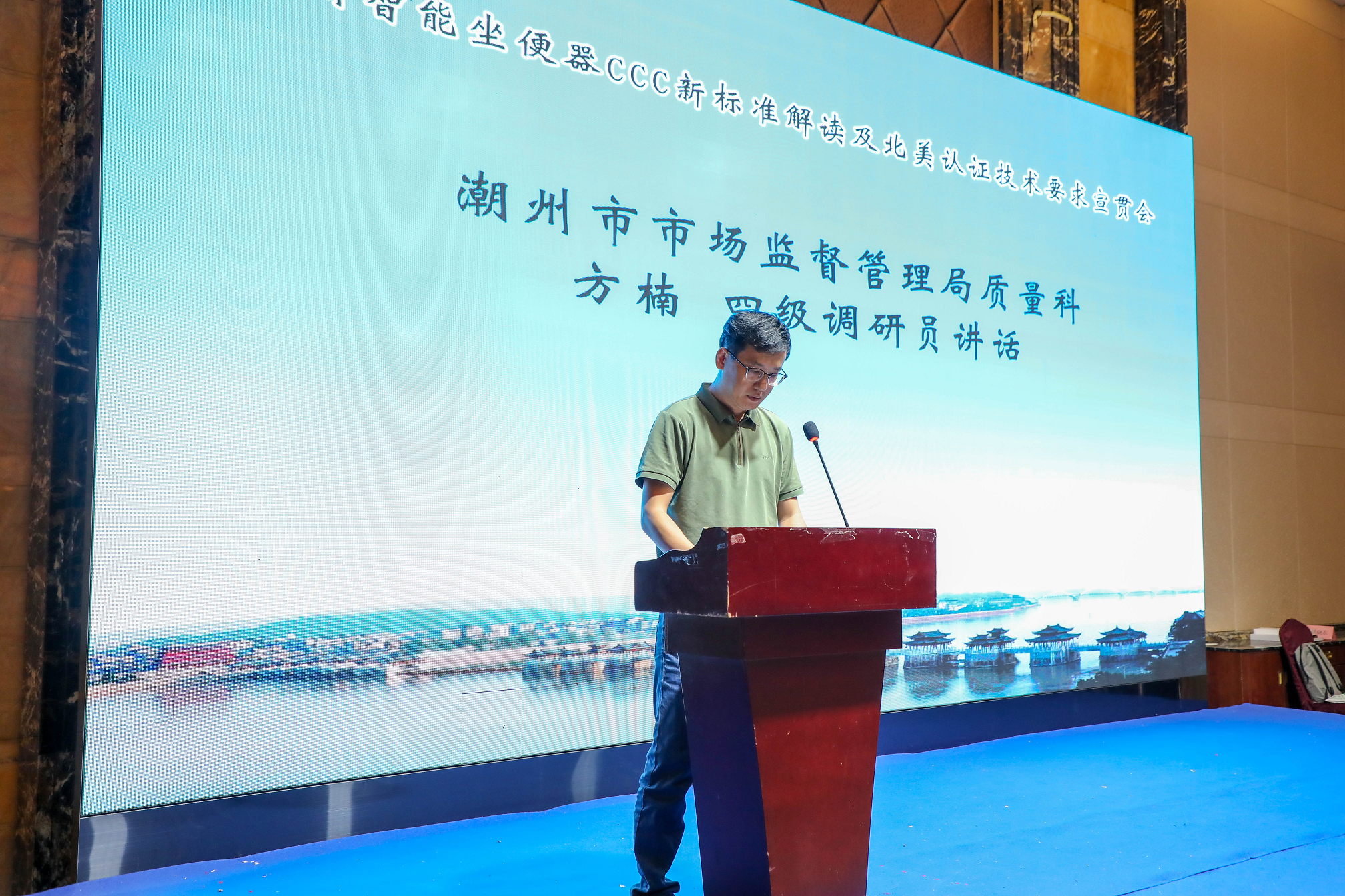 接着,潮州市市场监督管理局质量科处长方楠发表讲话,从政策监管角度阐述了标准执行的重要性。他表示,市场监管局将加强事中事后监管,推动企业落实主体责任,同时也将积极服务企业,助力潮州智能卫浴产业实现高质量发展。两位领导的发言明确了"监管与服务并重"的导向,为整场会议奠定了基调。