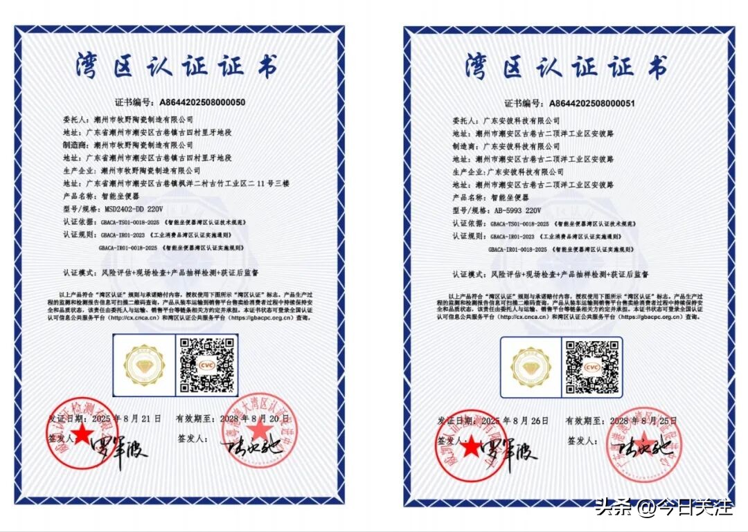今年以来,潮州市市场监管局主动作为,在全国率先牵头推动智能坐便器“湾区认证”落地实施,成功指导潮州市牧野陶瓷制造有限公司拿下全国首张《湾区认证证书》,一举实现潮州在该领域的“零的突破”,标志着潮州实现从“跟跑标准”到“制定标准”的跨越。